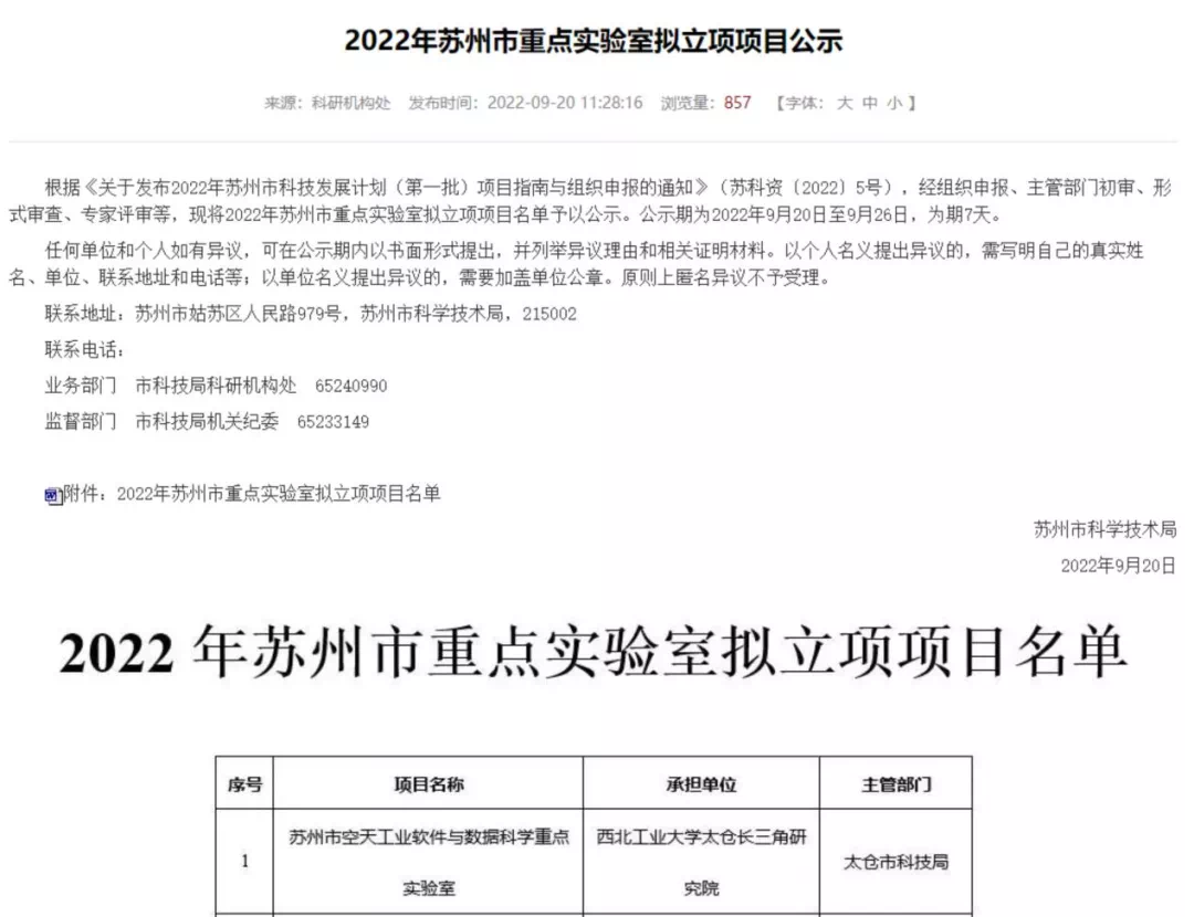 9月20日,苏州市科学技术局发布《2022年苏州市重点实验室拟立项项目公示》,由西北工业大学太仓长三角研究院承建、澳门威尼斯人网上赌场