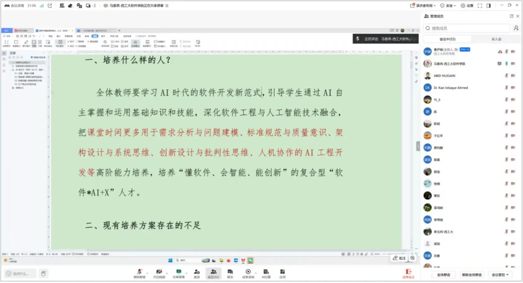 会议最后,马春燕对后续培养方案修订、课程内容重构等重点工作进行了明确分工,进一步细化了时间节点和具体产出要求。并号召全体教师勠力同心,以主动求变的勇气和立德树人的担当,将“软件*AI+X”的理念落到实处,真正培养出能驾驭AI、运用专业知识解决行业领域复杂软件问题的复合型软件人才,为学生的未来发展和国家软件事业保驾护航。